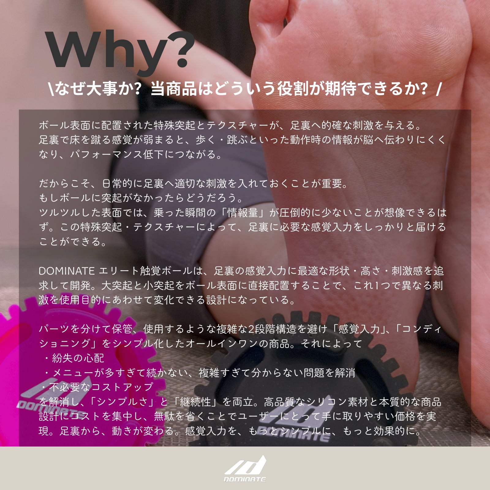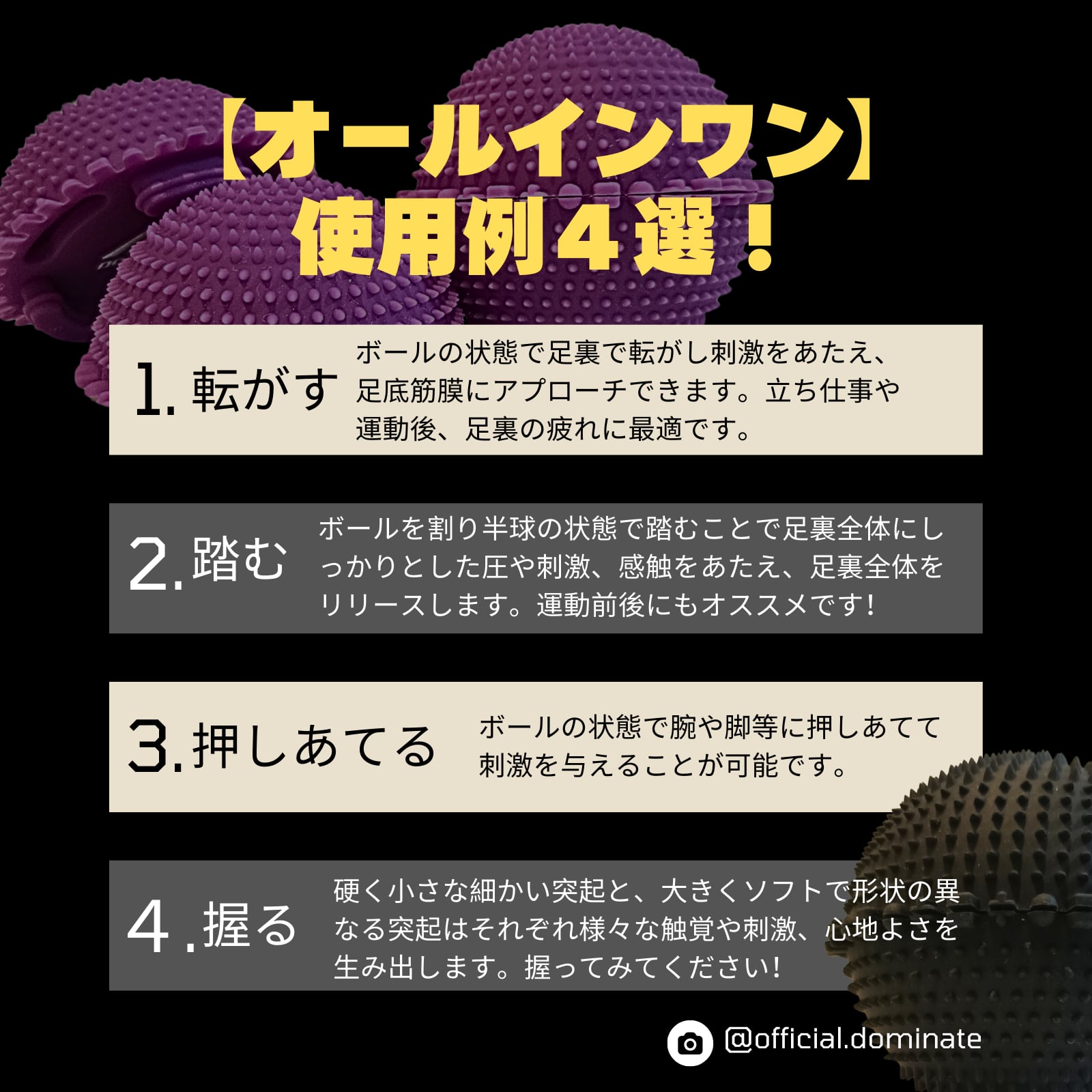 ③特殊突起設計とテクスチャー:表面に配置された特殊突起が、点・面・圧の刺激を足裏全体に与えます!DOMINATE エリート触覚ボールは、足裏の感覚入力に最適な形状・高さ・刺激感を追求して開発。大突起と小突起をボール表面に直接配置することで、これ1つで異なる刺激を使用目的にあわせて変化できる設計になっている。パーツを分けて保管、使用するような複雑な2段階構造を避け「感覚入力」、「コンディショニング」の本質に注力を注ぎ、シンプル化したオールインワンの商品。それによって「紛失の心配」、「メニューが多すぎて続かない、複雑すぎて分からない」、「不要なコストアップ」の3つの問題を解消。「シンプルさ」と「継続性」を両立。
