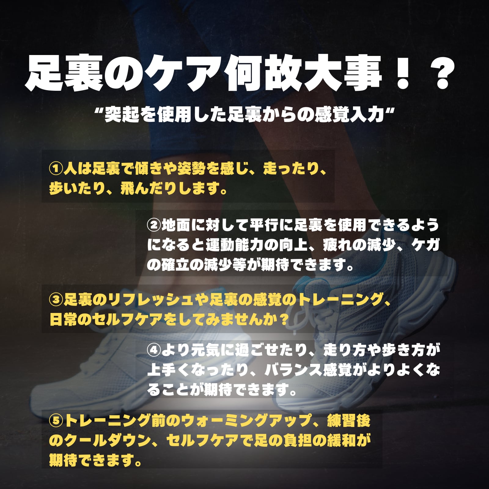 ②足裏から感覚を呼び覚ます触覚コンディショニングボール:足裏(足底)への刺激を通じて、身体の感覚入力にアプローチ。踏む・転がす等だけのシンプルな動作で、足裏への意識を高め、日常やトレーニング前後のコンディショニングをサポートします!